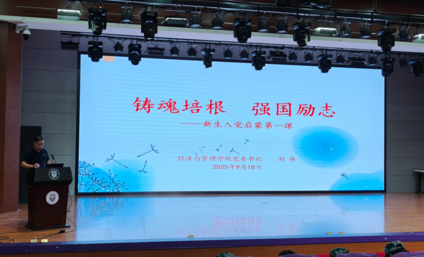 为全面贯彻落实习近平新时代中国特色社会主义思想,深入贯彻落实党的二十大和二十届二中、三中全会精神,全面落实习近平总书记关于教育的重要论述和全国教育大会精神,进一步落实立德树人根本任务,深化爱党爱国爱社会主义教育,2025年9月18日,经济与管理学院党委书记刘伟为2025级全体新生讲授“铸魂培根 强国励志”入党启蒙第一课。
