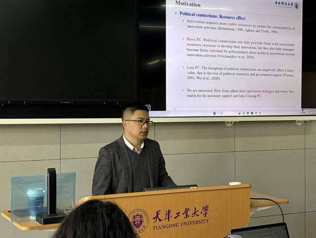 首场报告以“Who Can Help Me: The Impact of De-politicization On Collaborative Innovation”为主题。梁上坤教授围绕其最新研究成果,从政治关联动态变化的视角系统阐释了去政治化对企业合作创新的影响。通过对研究动机、问题提出、背景分析、实证检验及结论的深入剖析,结合扎实的理论梳理与严谨的数据分析,梁教授指出,合作创新可作为企业失去政治关联后的韧性应对策略。现场师生围绕报告内容积极提问、热烈交流,学术氛围浓厚,对相关领域的前沿动态有了更为深刻的理解。
